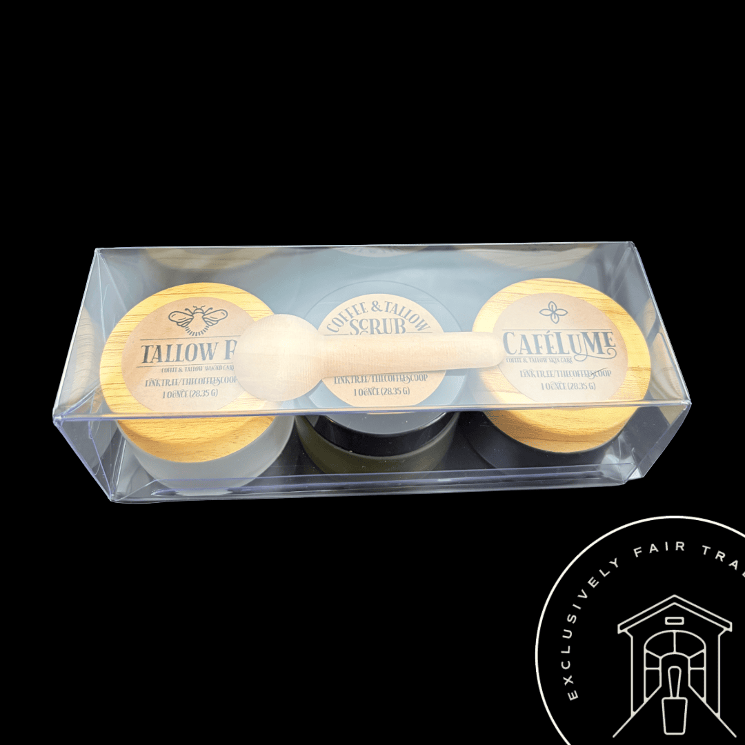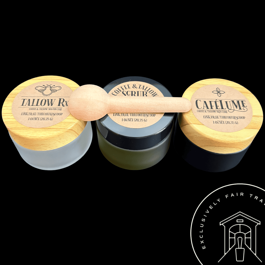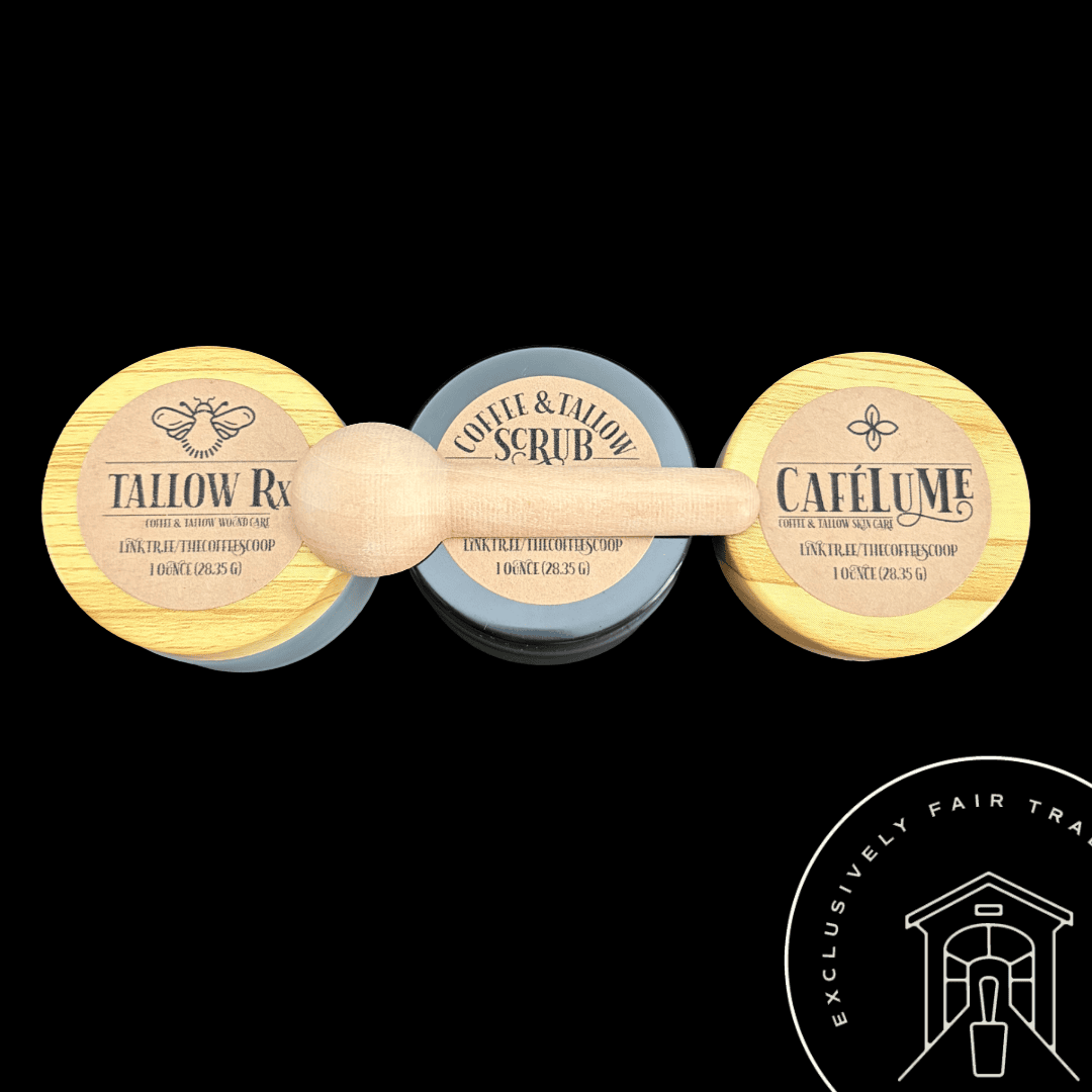 Our three most popular Coffee & Tallow products in one Collection: Tallow Rx, Coffee & Tallow Scrub, and CaféLUME. All organic ingredients and local: tallow from Lima Farm, processed by Chef Casey, Helpful Foodie, Manūka Honey, local bees wax, Jojoba. Each jar is 1 ounce.